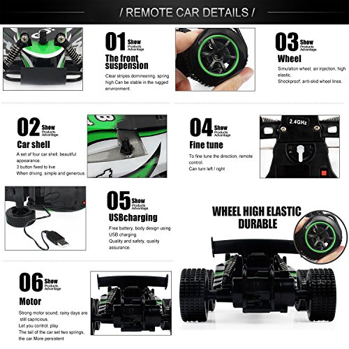 High Quality Material: Fixed with dozens of screws to ensure the rc car firm and durable; and with High-quality imported PVC materials which is super flexible; make the car more ruggedness and crashworthiness; With direction spinner in the bottom, can adjust the car automatically when it not walking a straight line.