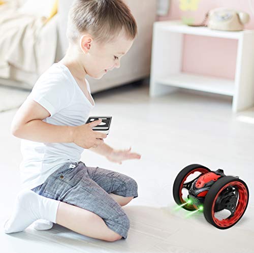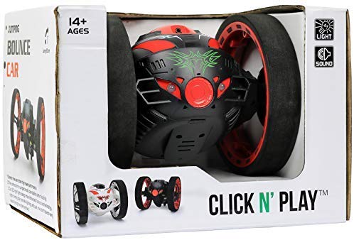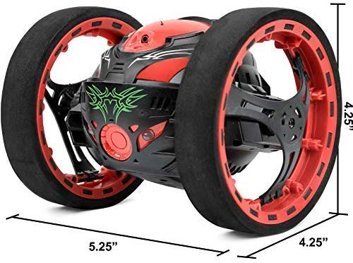 Incredible RC jumping bouncing stunt car with 2 large shock-proof wheels and fun lights and sounds.