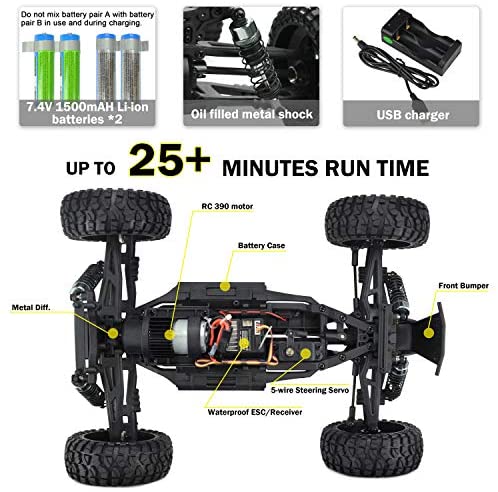 HOBBY GRADE CONFIGURATION: Featuring front and rear independent suspension with heightened ground clearance, this rc car employs natural rubber tires, metal differential cups, and maintenance spare wheel. This 4 wheel drive rc off road car is definitely more stable and faster than 2 wheel drive ones.