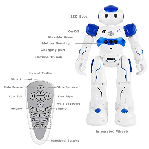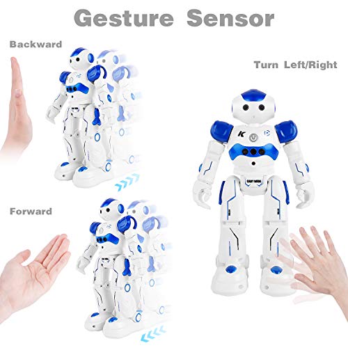 【Remote and Hand Gestures Control Robot】You can use the remote or do hand gestures to control this smart robot toy,it can move forward,backward,turn left and turn right simply through your gestures.The eyes light up with bright blue LED’S when it moves.