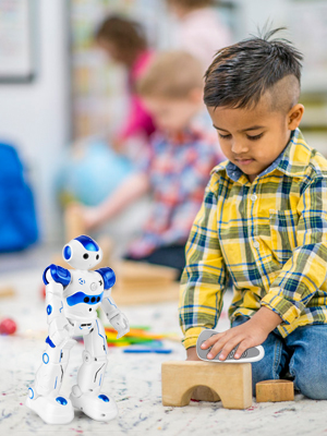 This RC robot features rounded edges and soft curves to eliminate potential injuries.