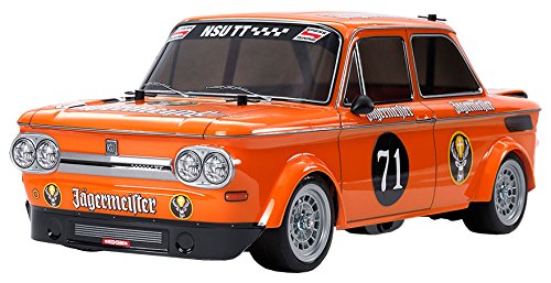 This radio control model recreates the Jagermeister-sponsored edition of the NSU TT. A race-oriented variant of the Prinz, of which almost 2, 500 examples were built in the late 1960s and early 1970s by NSU Motorenwerke AG. It was powered by a variety of inline-4 engines depending upon the spec. The faithfully recreated polycarbonate body shell sits atop Tamiya’s M-05 FWD chassis platform which is easy to assemble and provides nimble and responsive front wheel drive handling characteristics.